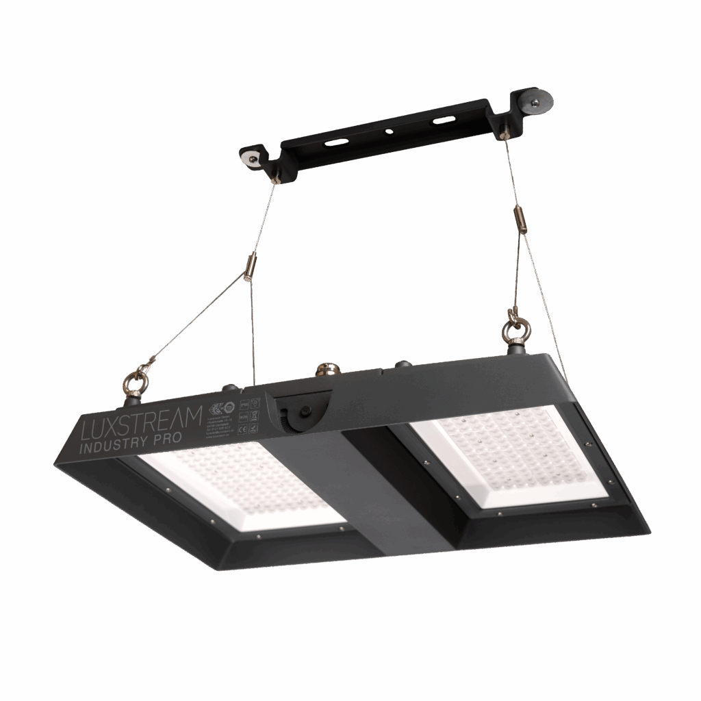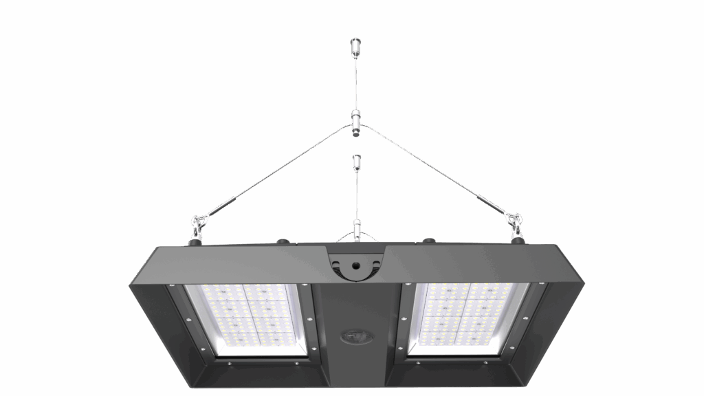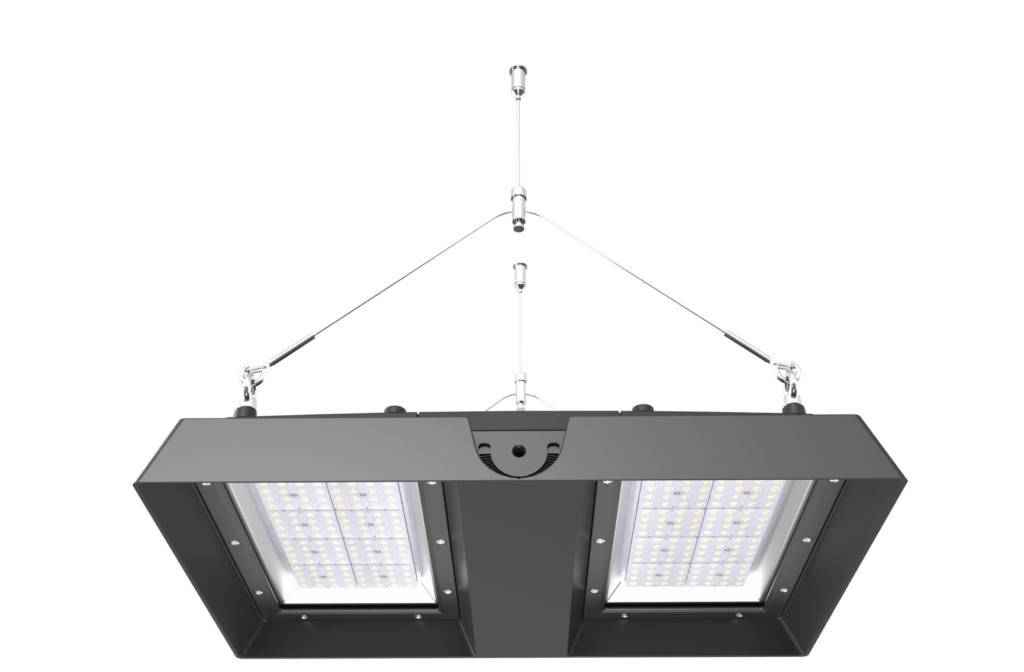 Höchst effizienter LED-Hallenstrahler für Industrie- und Lagerflächen. Am Seil oder Einpunkt-Kettenabhängung.