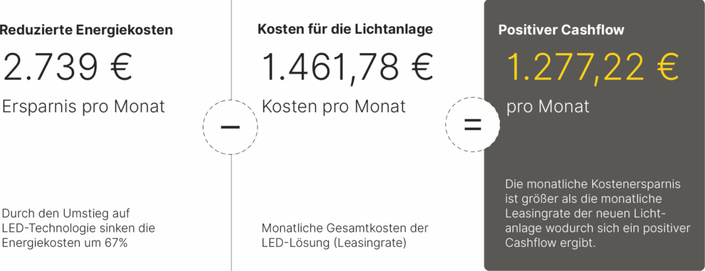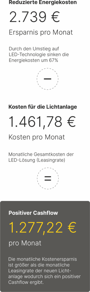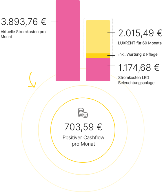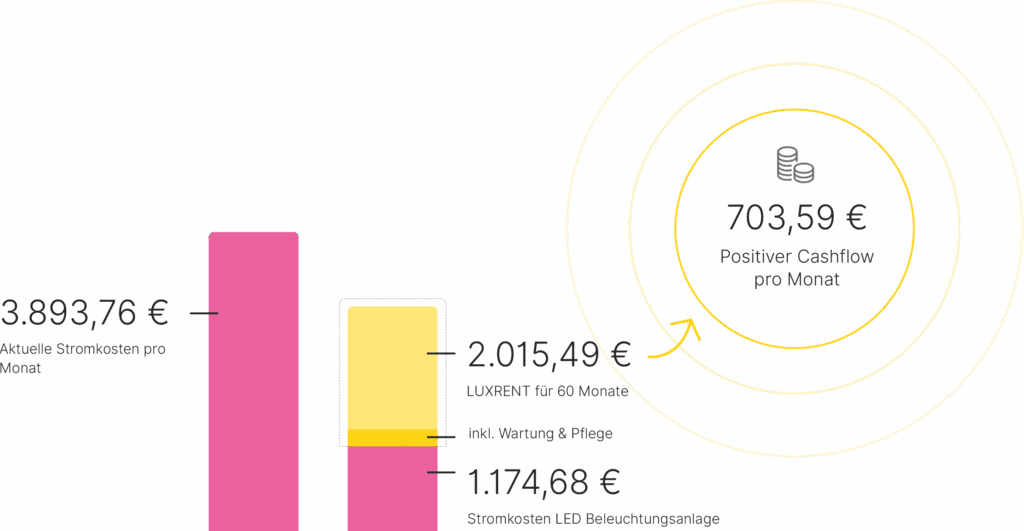Mit LUXRENT erhalten Sie eine moderne, energieeffiziente Lichtanlage – inklusive Planung und Montageleistung – und das ohne Anfangsinvestition. Noch besser – Aufgrund der aktuell hohen Energiekosten und einer langen täglichen Leuchtdauer, kann Ihre monatliche LUXRENT-Rate zusammen mit den gesenkten LED-Energiekosten sogar günstiger sein als Ihre üblichen monatlichen Energiekosten.