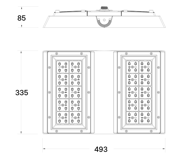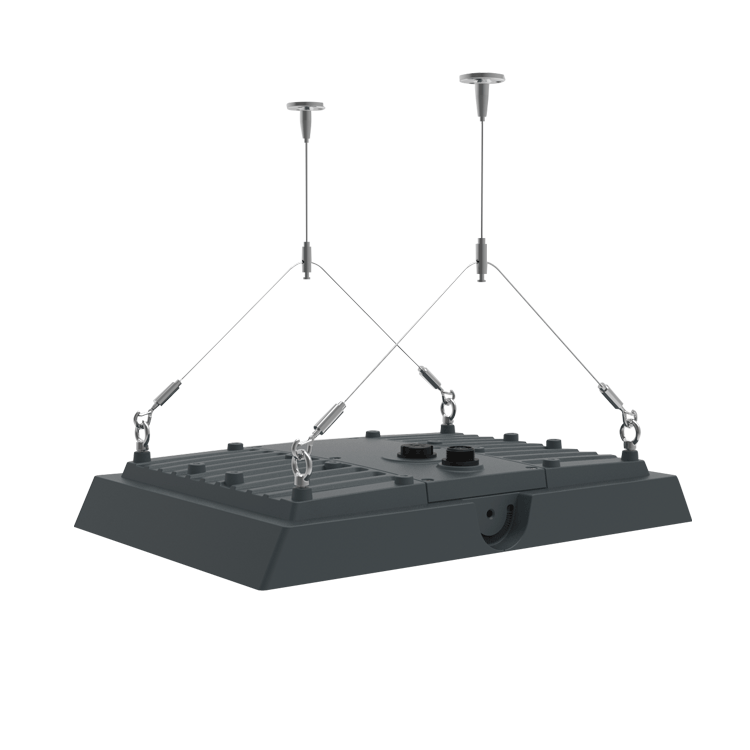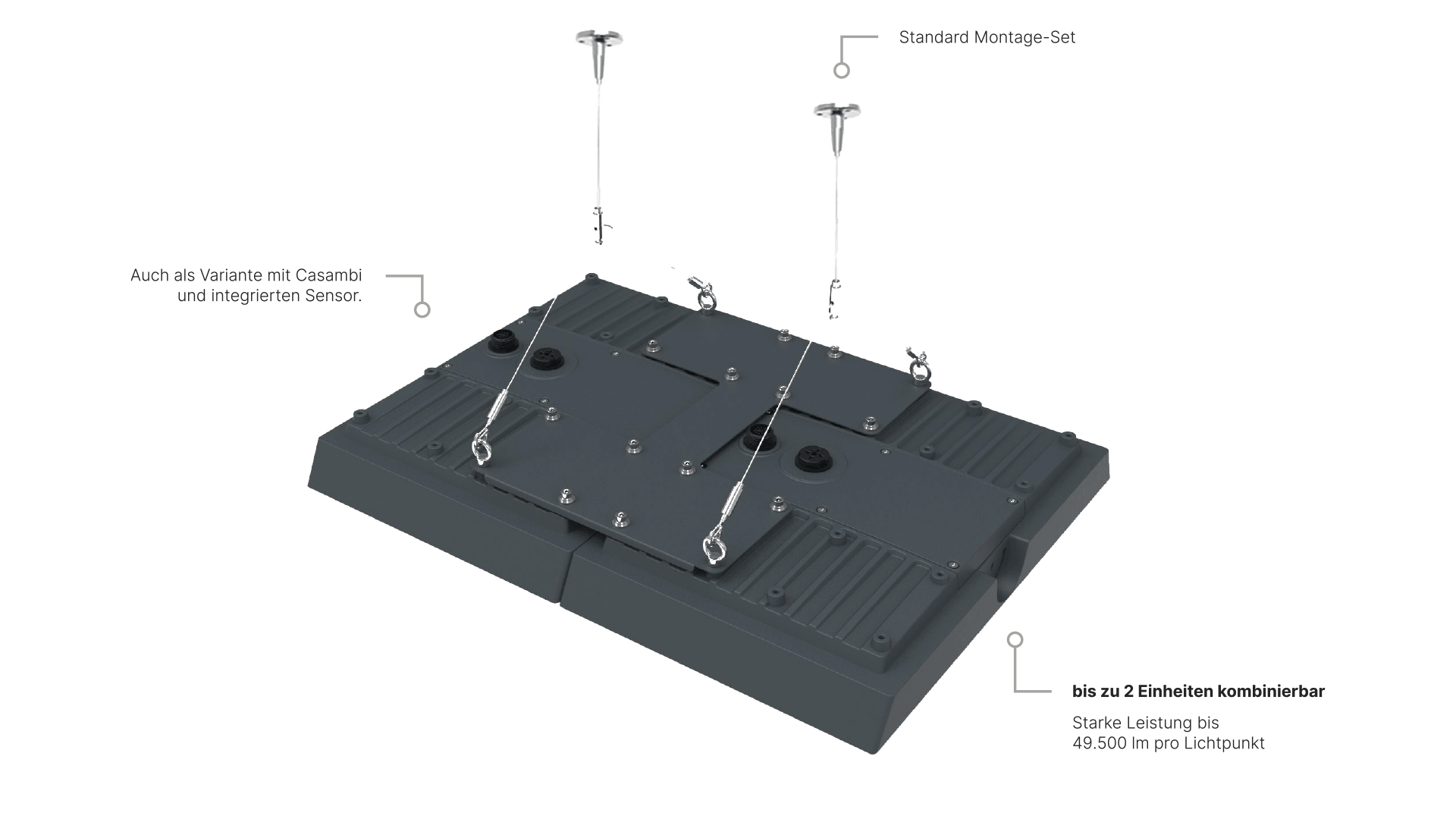 Die durchdachte Konstruktion des Gehäuses ermöglicht es, zwei Strahler einfach zu kombinieren und per Abhängung zu montieren. So lassen sich Lichtleistungen von bis zu 50.000 Lumen pro Lichtpunkt erzielen – perfekt für den Einsatz in besonders hohen Montagehöhen.